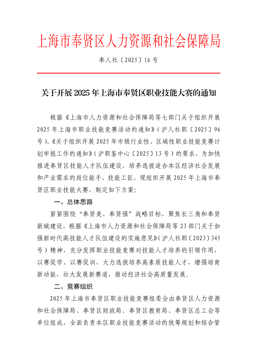 ??根據(jù)《上海市人力資源和社會(huì)保障局等七部門關(guān)于組織開(kāi)展2025年上海市職業(yè)技能競(jìng)賽活動(dòng)的通知》(滬人社職〔2025〕96號(hào))、《關(guān)于組織開(kāi)展2025年市級(jí)行業(yè)性、區(qū)域性職業(yè)技能競(jìng)賽計(jì)劃申報(bào)工作的通知》(滬職鑒中心〔2025〕13號(hào))的要求,為加快推進(jìn)奉賢區(qū)技能人才隊(duì)伍建設(shè),培養(yǎng)選拔適合本區(qū)經(jīng)濟(jì)社會(huì)發(fā)展和產(chǎn)業(yè)需求的崗位能手、技能工匠,現(xiàn)組織開(kāi)展2025年上海市奉賢區(qū)職業(yè)技能大賽,制定如下方案: