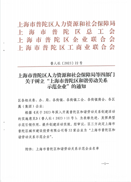 ??根據(jù)《關(guān)于2023年深入開(kāi)展普陀區(qū)和諧勞動(dòng)關(guān)系創(chuàng)建活動(dòng)的實(shí)施意見(jiàn)》(普人社﹝2023﹞11號(hào)),為表彰先進(jìn),發(fā)揮典型示范引領(lǐng)作用,提升創(chuàng)建活動(dòng)實(shí)效。經(jīng)審議,區(qū)三方?jīng)Q定上海市普陀區(qū)城市建設(shè)投資有限公司等52家企業(yè)為“上海市普陀區(qū)和諧勞動(dòng)關(guān)系示范企業(yè)”。