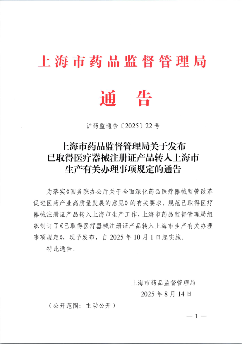 ??為落實(shí)《國務(wù)院辦公廳關(guān)于全面深化藥品醫(yī)療器械監(jiān)管改革 促進(jìn)醫(yī)藥產(chǎn)業(yè)高質(zhì)量發(fā)展的意見》的有關(guān)要求,規(guī)范已取得醫(yī)療器械注冊(cè)證產(chǎn)品轉(zhuǎn)入上海市生產(chǎn)工作,上海市藥品監(jiān)督管理局組織制訂了《已取得醫(yī)療器械注冊(cè)證產(chǎn)品轉(zhuǎn)入上海市生產(chǎn)有關(guān)辦理事項(xiàng)規(guī)定》,現(xiàn)予發(fā)布,自2025年10月1日起實(shí)施。