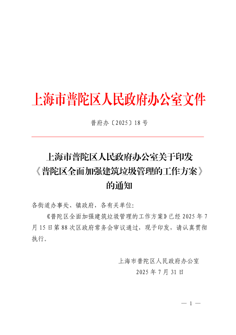 ??《普陀區(qū)全面加強(qiáng)建筑垃圾管理的工作方案》已經(jīng)2025年7月15日第88次區(qū)政府常務(wù)會審議通過,現(xiàn)予印發(fā),請認(rèn)真貫徹執(zhí)行。