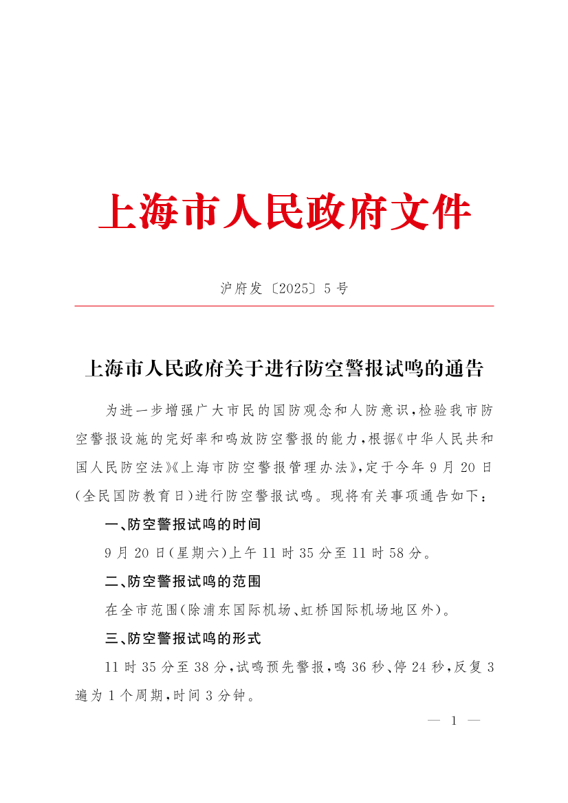 ??為進(jìn)一步增強(qiáng)廣大市民的國(guó)防觀念和人防意識(shí),檢驗(yàn)我市防空警報(bào)設(shè)施的完好率和鳴放防空警報(bào)的能力,根據(jù)《中華人民共和國(guó)人民防空法》《上海市防空警報(bào)管理辦法》,定于今年9月20日(全民國(guó)防教育日)進(jìn)行防空警報(bào)試?guó)Q?,F(xiàn)將有關(guān)事項(xiàng)通告如下: