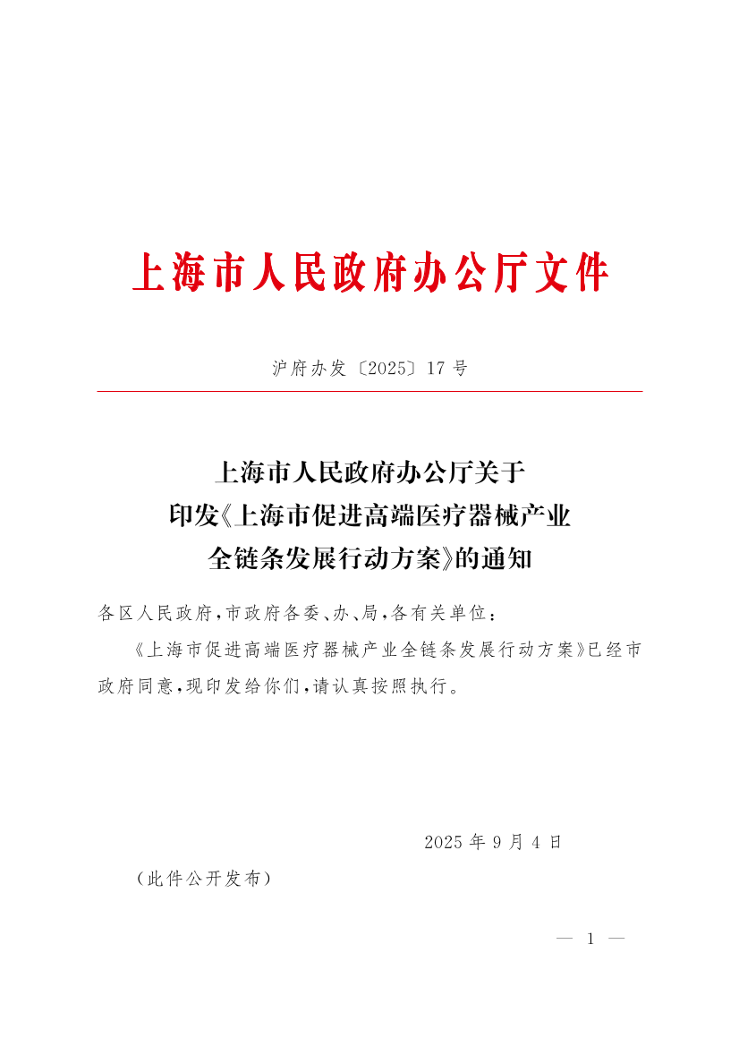 上海市人民政府辦公廳關(guān)于印發(fā)《上海市促進(jìn)高端醫(yī)療器械產(chǎn)業(yè)全鏈條發(fā)展行動(dòng)方案》的通知