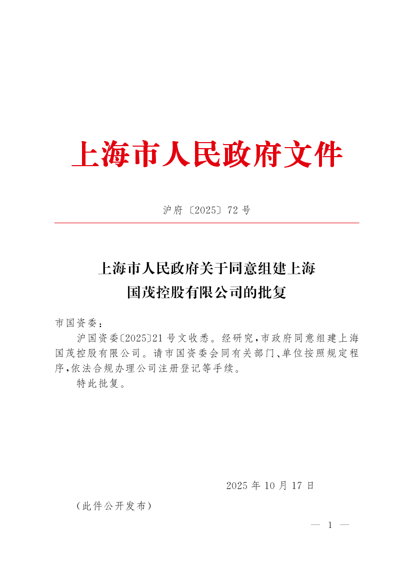??滬國資委〔2025〕21號(hào)文收悉。經(jīng)研究,市政府同意組建上海國茂控股有限公司。請(qǐng)市國資委會(huì)同有關(guān)部門、單位按照規(guī)定程序,依法合規(guī)辦理公司注冊(cè)登記等手續(xù)。