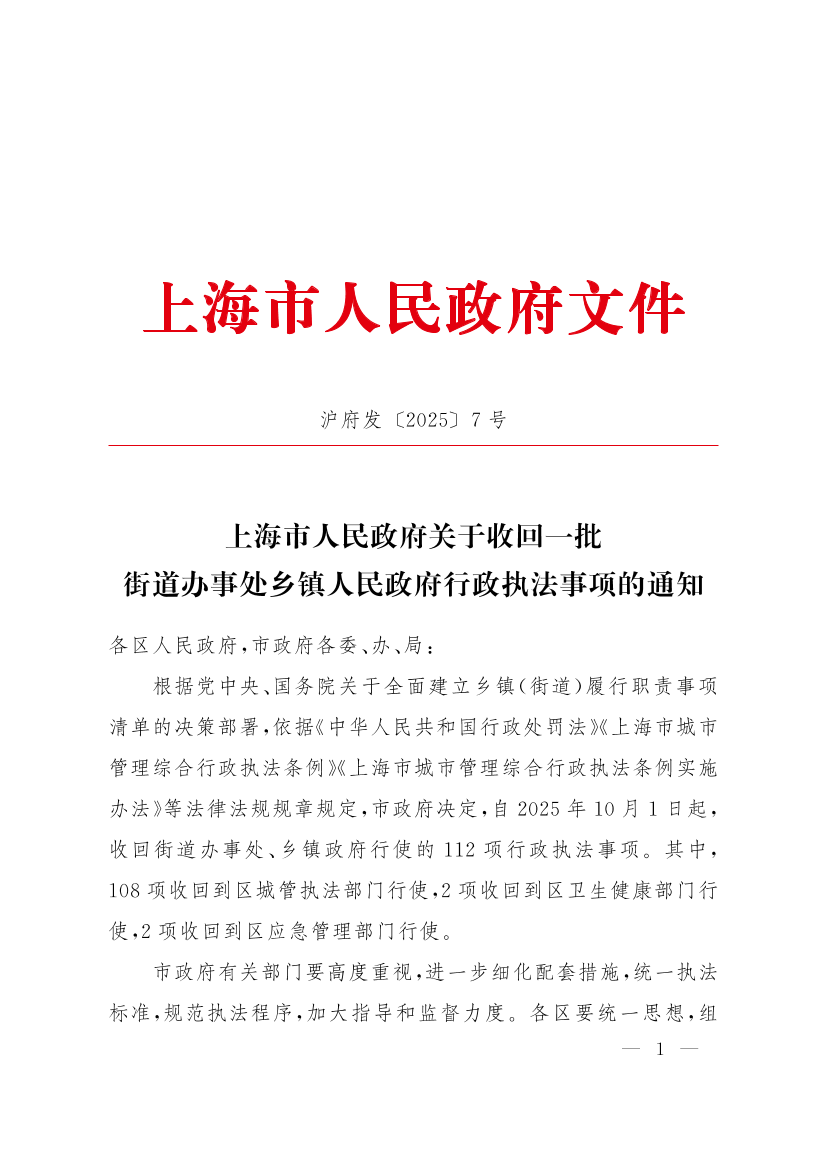 ??根據(jù)黨中央、國(guó)務(wù)院關(guān)于全面建立鄉(xiāng)鎮(zhèn)(街道)履行職責(zé)事項(xiàng)清單的決策部署,依據(jù)《中華人民共和國(guó)行政處罰法》《上海市城市管理綜合行政執(zhí)法條例》《上海市城市管理綜合行政執(zhí)法條例實(shí)施辦法》等法律法規(guī)規(guī)章規(guī)定,市政府決定,自2025年10月1日起,收回街道辦事處、鄉(xiāng)鎮(zhèn)政府行使的112項(xiàng)行政執(zhí)法事項(xiàng)。其中,108項(xiàng)收回到區(qū)城管執(zhí)法部門(mén)行使,2項(xiàng)收回到區(qū)衛(wèi)生健康部門(mén)行使,2項(xiàng)收回到區(qū)應(yīng)急管理部門(mén)行使。