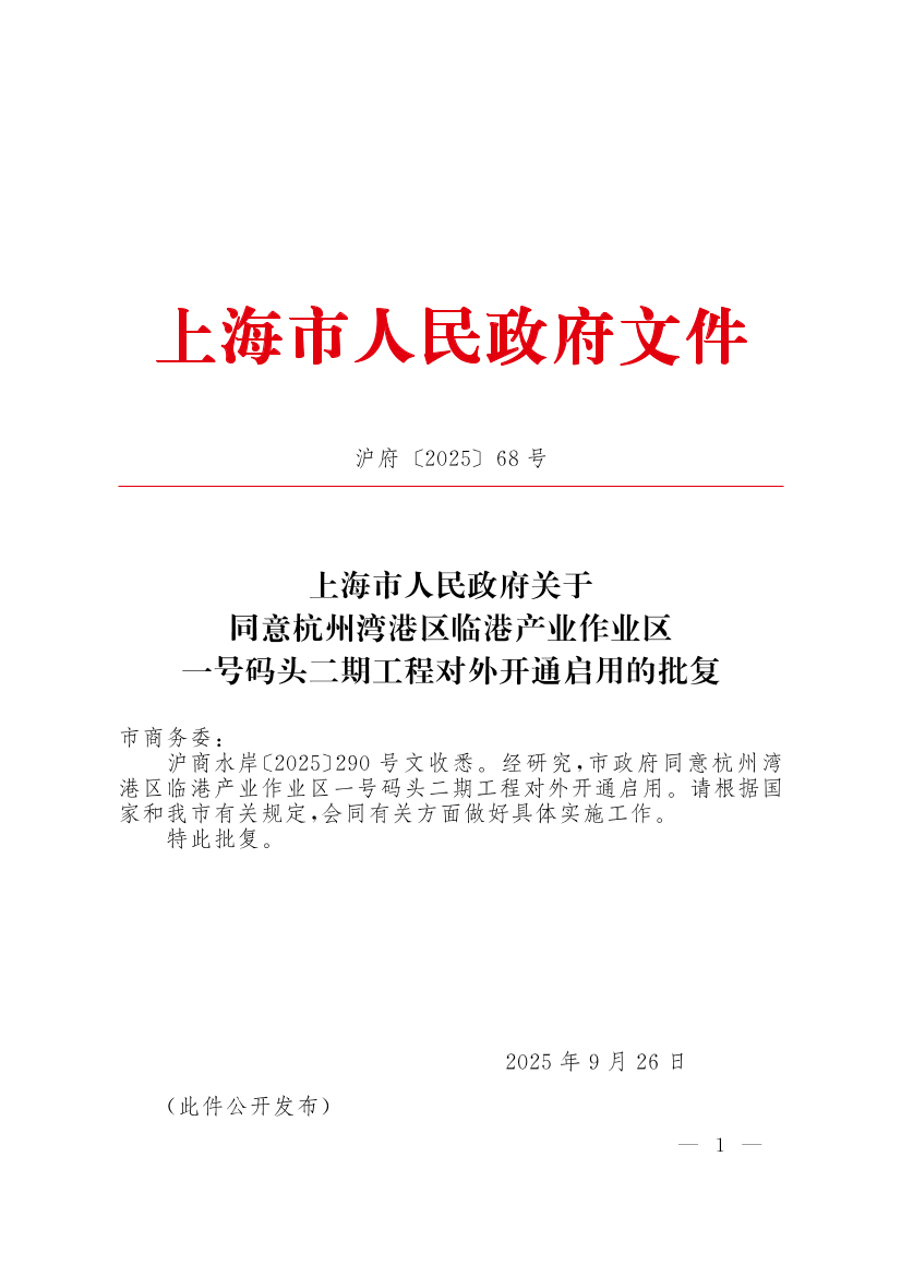 ??滬商水岸〔2025〕290號(hào)文收悉。經(jīng)研究,市政府同意杭州灣港區(qū)臨港產(chǎn)業(yè)作業(yè)區(qū)一號(hào)碼頭二期工程對(duì)外開通啟用。請根據(jù)國家和我市有關(guān)規(guī)定,會(huì)同有關(guān)方面做好具體實(shí)施工作。