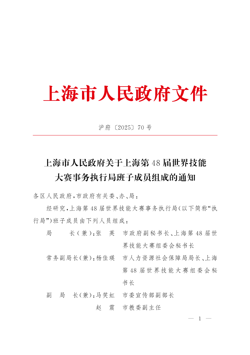 上海市人民政府關(guān)于上海第48屆世界技能大賽事務(wù)執(zhí)行局班子成員組成的通知