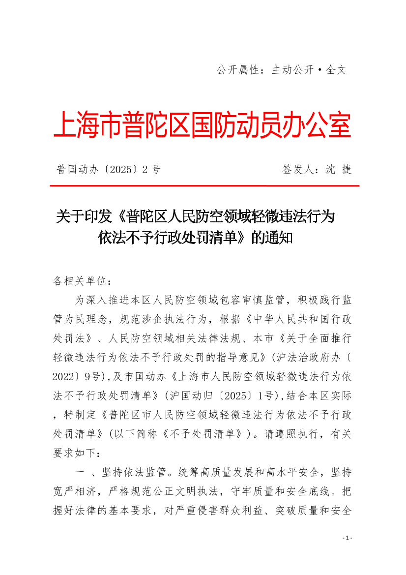 關于印發(fā)《普陀區(qū)人民防空領域輕微違法行為依法不予行政處罰清單》的通知