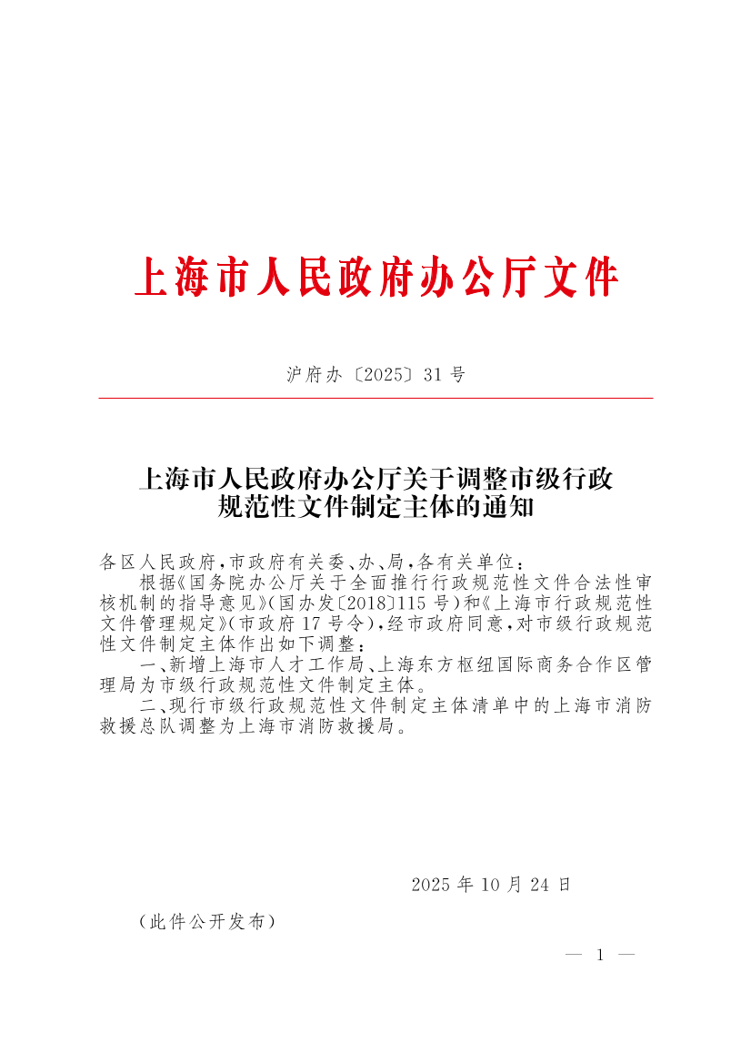 ??根據(jù)《國務(wù)院辦公廳關(guān)于全面推行行政規(guī)范性文件合法性審核機(jī)制的指導(dǎo)意見》(國辦發(fā)〔2018〕115號(hào))和《上海市行政規(guī)范性文件管理規(guī)定》(市政府17號(hào)令),經(jīng)市政府同意,對(duì)市級(jí)行政規(guī)范性文件制定主體作出如下調(diào)整: