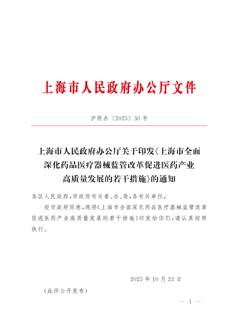 上海市人民政府辦公廳關于印發(fā)《上海市全面深化藥品醫(yī)療器械監(jiān)管改革促進醫(yī)藥產(chǎn)業(yè)高質(zhì)量發(fā)展的若干措施》的通知
