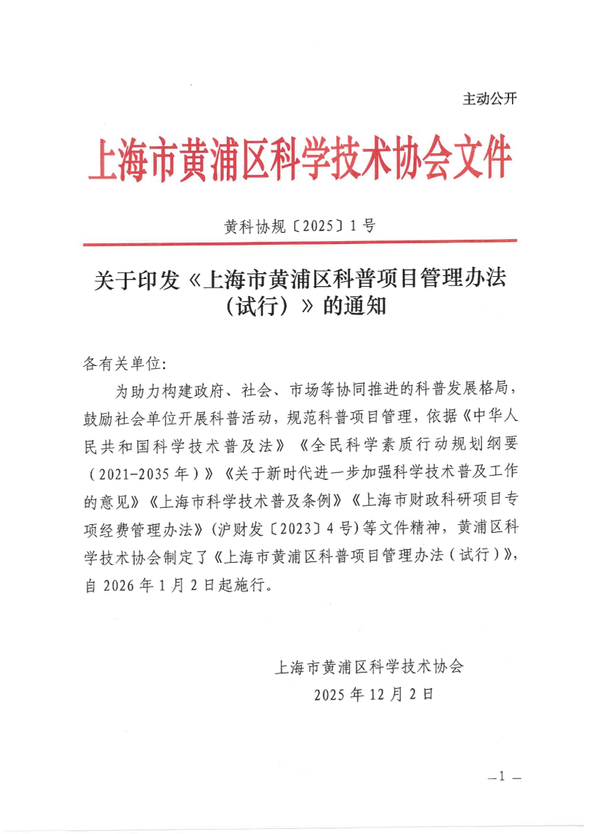 ??為助力構建政府、社會、市場等協(xié)同推進的科普發(fā)展格局,鼓勵社會單位開展科普活動,規(guī)范科普項目管理,依據(jù)《中華人民共和國科學技術普及法》《全民科學素質行動規(guī)劃綱要(2021-2035年)》《關于新時代進一步加強科學技術普及工作的意見》《上海市科學技術普及條例》《上海市財政科研項目專項經(jīng)費管理辦法》(滬財發(fā)〔2023〕4號)等文件精神,黃浦區(qū)科學技術協(xié)會制定了《上海市黃浦區(qū)科普項目管理辦法(試行)》,自2026年1月2日起施行。