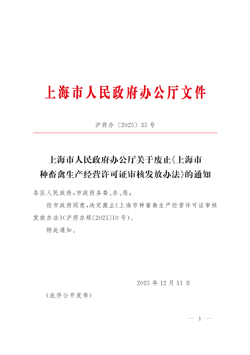 ??經(jīng)市政府同意,決定廢止《上海市種畜禽生產(chǎn)經(jīng)營許可證審核發(fā)放辦法》(滬府辦規(guī)〔2021〕10號)。