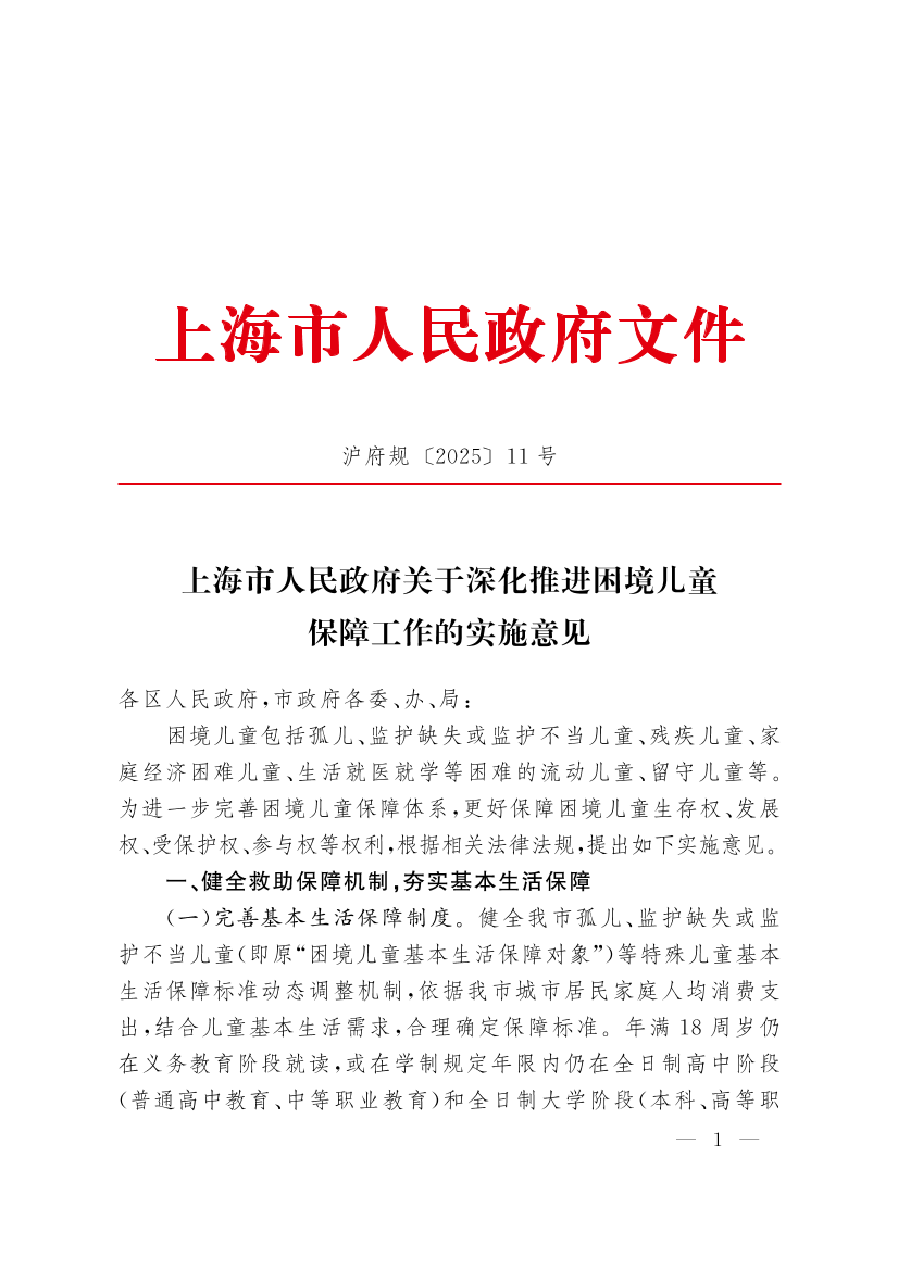 上海市人民政府關(guān)于深化推進(jìn)困境兒童保障工作的實(shí)施意見