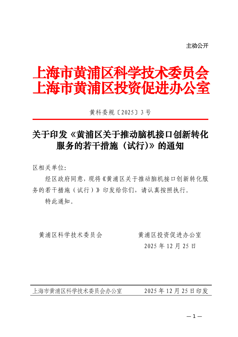 關(guān)于印發(fā)《黃浦區(qū)關(guān)于推動腦機接口創(chuàng)新轉(zhuǎn)化服務的若干措施(試行)》的通知
