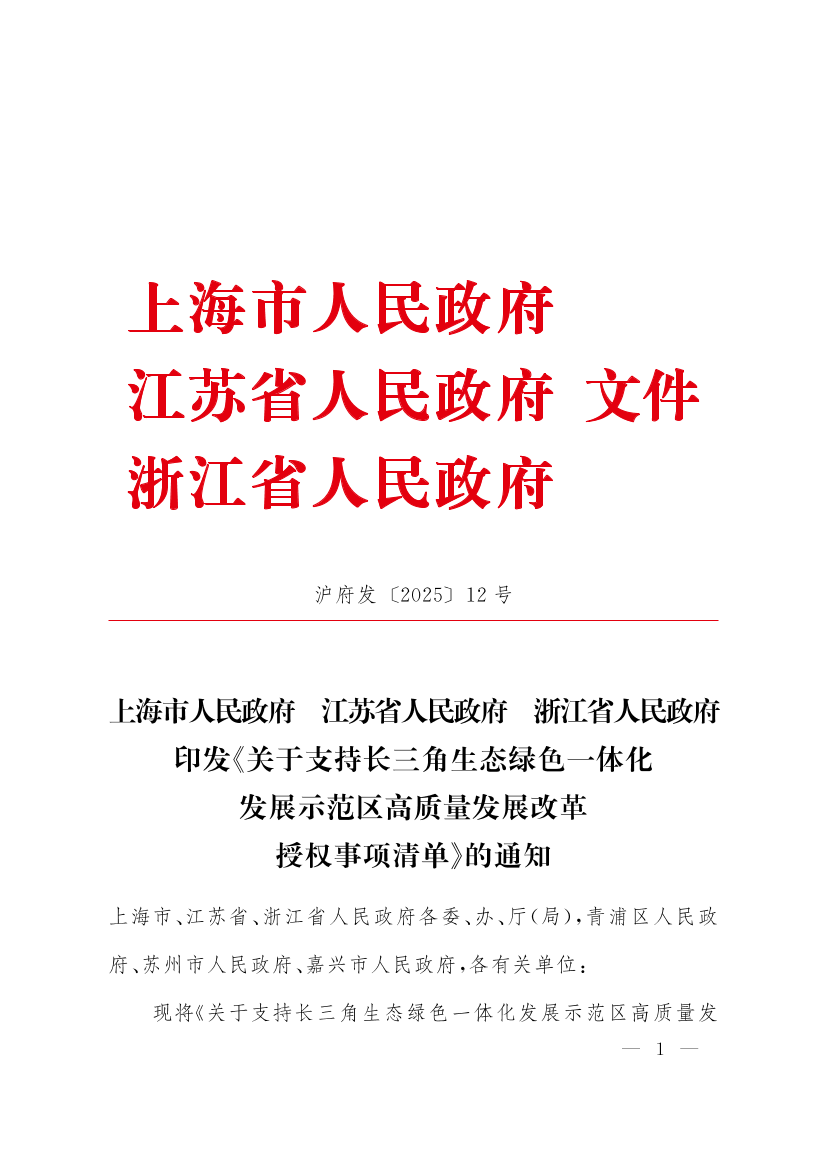 ??現(xiàn)將《關(guān)于支持長(zhǎng)三角生態(tài)綠色一體化發(fā)展示范區(qū)高質(zhì)量發(fā)展改革授權(quán)事項(xiàng)清單》印發(fā)給你們,請(qǐng)認(rèn)真按照?qǐng)?zhí)行。