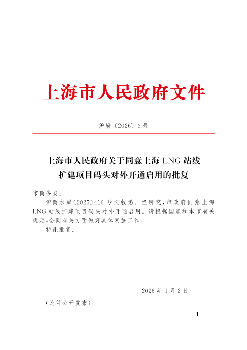 ??滬商水岸〔2025〕416號文收悉。經(jīng)研究,市政府同意上海LNG站線擴建項目碼頭對外開通啟用。請根據(jù)國家和本市有關(guān)規(guī)定,會同有關(guān)方面做好具體實施工作。