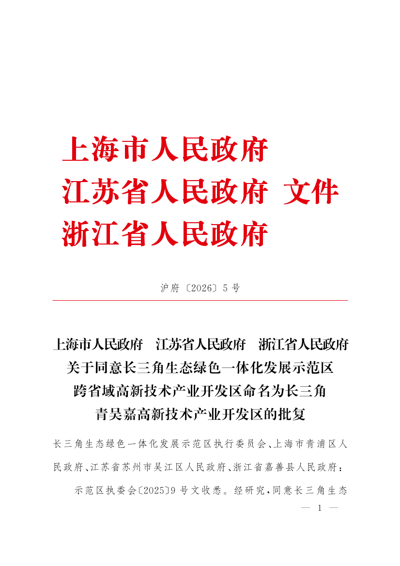 上海市人民政府 江蘇省人民政府 浙江省人民政府關(guān)于同意長三角生態(tài)綠色一體化發(fā)展示范區(qū)跨省域高新技術(shù)產(chǎn)業(yè)開發(fā)區(qū)命名為長三角青吳嘉高新技術(shù)產(chǎn)業(yè)開發(fā)區(qū)的批復(fù)