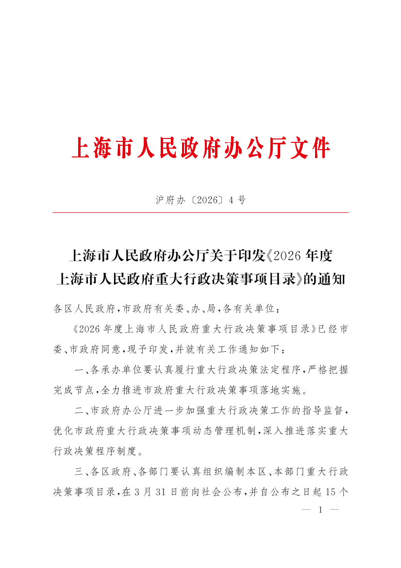 上海市人民政府辦公廳關(guān)于印發(fā)《2026年度上海市人民政府重大行政決策事項(xiàng)目錄》的通知