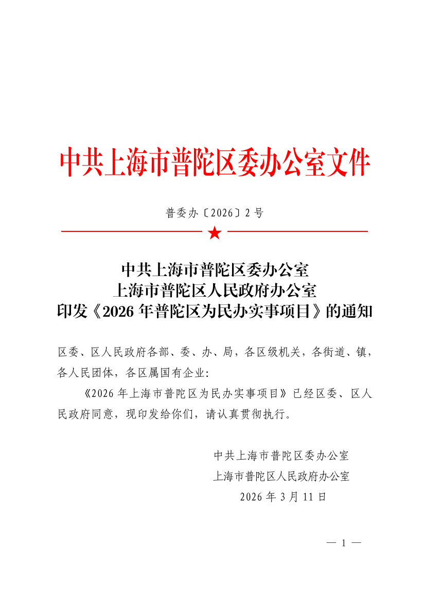 中共上海市普陀區(qū)委辦公室 上海市普陀區(qū)人民政府辦公室印發(fā)《2026年普陀區(qū)為民辦實事項目》的通知