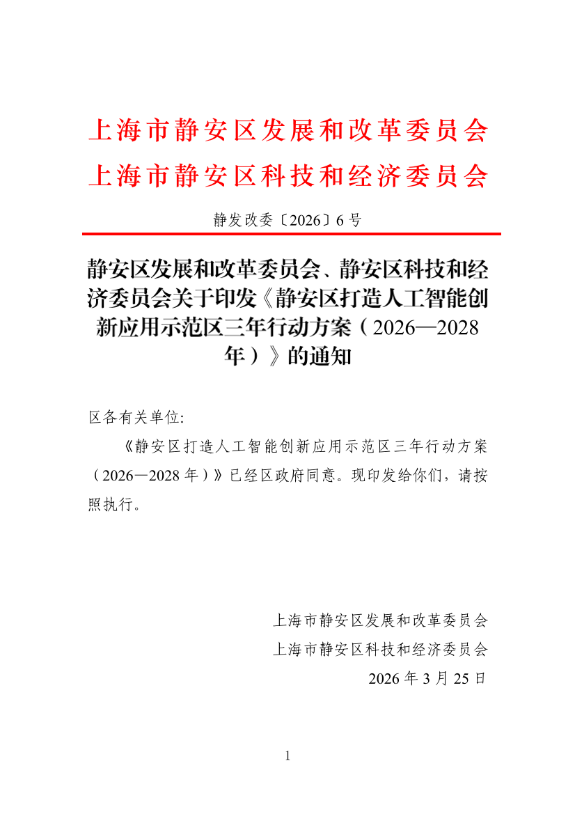 關(guān)于印發(fā)《靜安區(qū)打造人工智能創(chuàng)新應(yīng)用示范區(qū)三年行動(dòng)方案(2026—2028年)》的通知