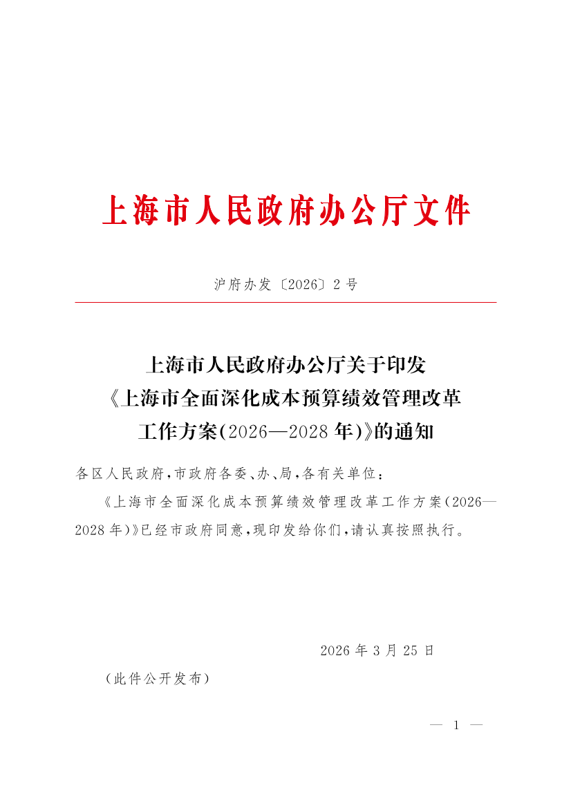 ??《上海市全面深化成本預(yù)算績效管理改革工作方案(2026—2028年)》已經(jīng)市政府同意,現(xiàn)印發(fā)給你們,請認(rèn)真按照執(zhí)行。