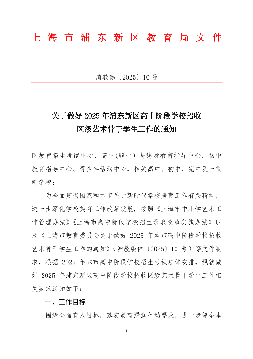 ??為全面貫徹國(guó)家和本市關(guān)于新時(shí)代學(xué)校美育工作有關(guān)精神,進(jìn)一步深化學(xué)校美育工作改革發(fā)展,按照《上海市中小學(xué)藝術(shù)工作管理辦法》《上海市高中階段學(xué)校招生錄取改革實(shí)施辦法》以及《上海市教育委員會(huì)關(guān)于做好2025年本市高中階段學(xué)校招收藝術(shù)骨干學(xué)生工作的通知》(滬教委體〔2025〕10號(hào))等文件要求,根據(jù)2025年本市高中階段學(xué)校招生考試總體安排,現(xiàn)就做好2025年浦東新區(qū)高中階段學(xué)校招收區(qū)級(jí)藝術(shù)骨干學(xué)生工作相關(guān)要求通知如下: