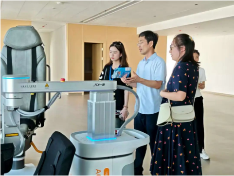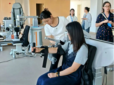 現(xiàn)場觀摩中,普陀區(qū)康復(fù)醫(yī)院工作人員帶領(lǐng)企業(yè)及群眾代表參觀新竣工驗收的康復(fù)大樓,介紹各項康復(fù)器械的用途。