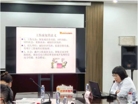 座談會上,普陀區(qū)康復(fù)醫(yī)院向受邀代表介紹未來普陀區(qū)康復(fù)醫(yī)院科室設(shè)置、醫(yī)療人員配備規(guī)劃及特色技術(shù)。同時,從醫(yī)學(xué)專業(yè)角度向受邀代表介紹工傷康復(fù)的重要性和必要性。區(qū)人社局向受邀代表介紹業(yè)務(wù)辦理依據(jù)、申請條件、申請流程等勞動能力鑒定及住院工傷康復(fù)相關(guān)政策內(nèi)容,認(rèn)真聽取受邀代表提出的問題及意見建議,并一一作出回應(yīng),獲得受邀代表的一致好評。