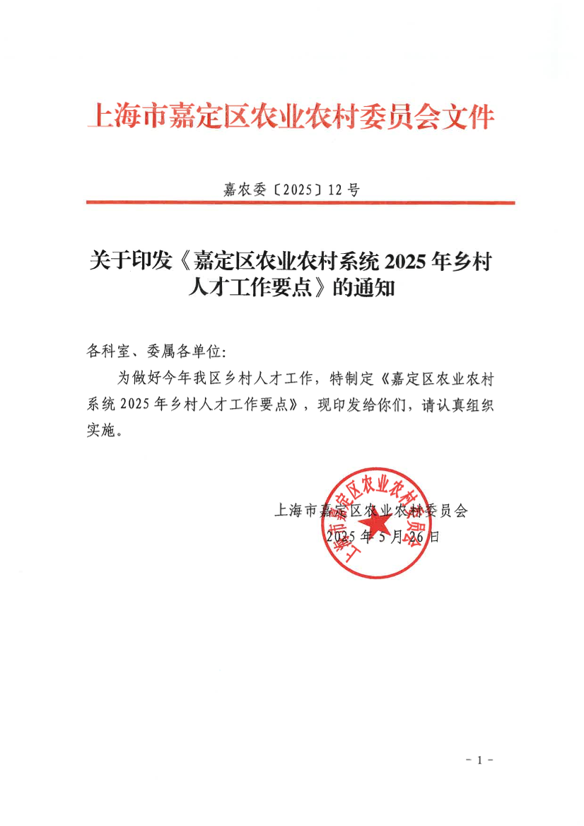 ??為做好今年我區(qū)鄉(xiāng)村人才工作,特制定《嘉定區(qū)農(nóng)業(yè)農(nóng)村系統(tǒng)2025年鄉(xiāng)村人才工作要點(diǎn)》,現(xiàn)印發(fā)給你們,請(qǐng)認(rèn)真組織實(shí)施。