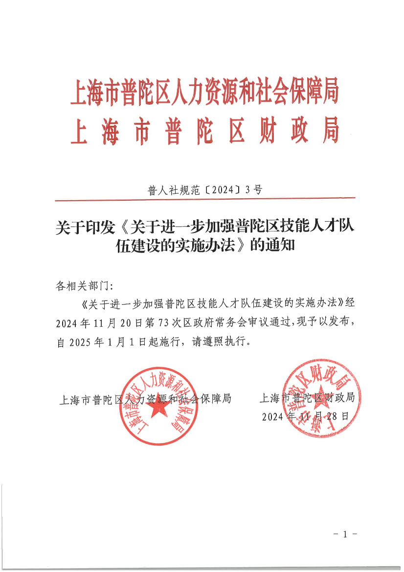 ??《關(guān)于進(jìn)一步加強普陀區(qū)技能人才隊伍建設(shè)的實施辦法》經(jīng)2024年11月20日第73次區(qū)政府常務(wù)會審議通過,現(xiàn)予以發(fā)布,自2025年1月1日起施行,請遵照執(zhí)行。