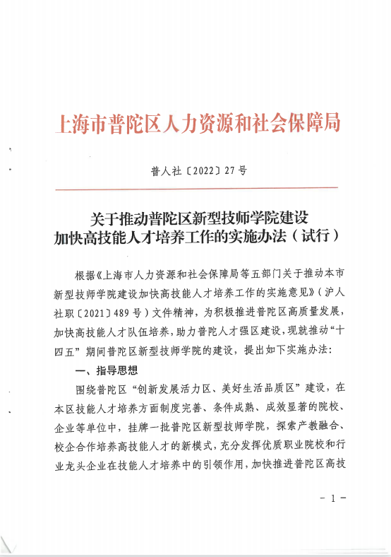 ??根據(jù)《上海市人力資源和社會保障局等五部門關(guān)于推動本市新型技師學(xué)院建設(shè)加快高技能人才培養(yǎng)工作的實施意見》(滬人社職〔2021〕489號)文件精神,為積極推進普陀區(qū)高質(zhì)量發(fā)展,加快高技能人才隊伍培養(yǎng),助力普陀人才強區(qū)建設(shè),現(xiàn)就推動““十四五””期間普陀區(qū)新型技師學(xué)院的建設(shè),提出如下實施辦法: