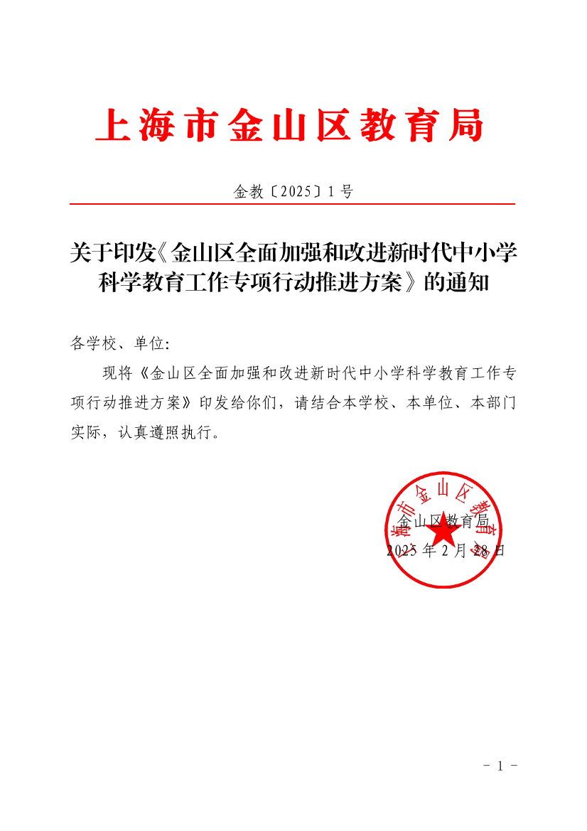 ??現(xiàn)將《金山區(qū)全面加強(qiáng)和改進(jìn)新時(shí)代中小學(xué)科學(xué)教育工作專項(xiàng)行動推進(jìn)方案》印發(fā)給你們,請結(jié)合本學(xué)校、本單位、本部門實(shí)際,認(rèn)真遵照執(zhí)行。