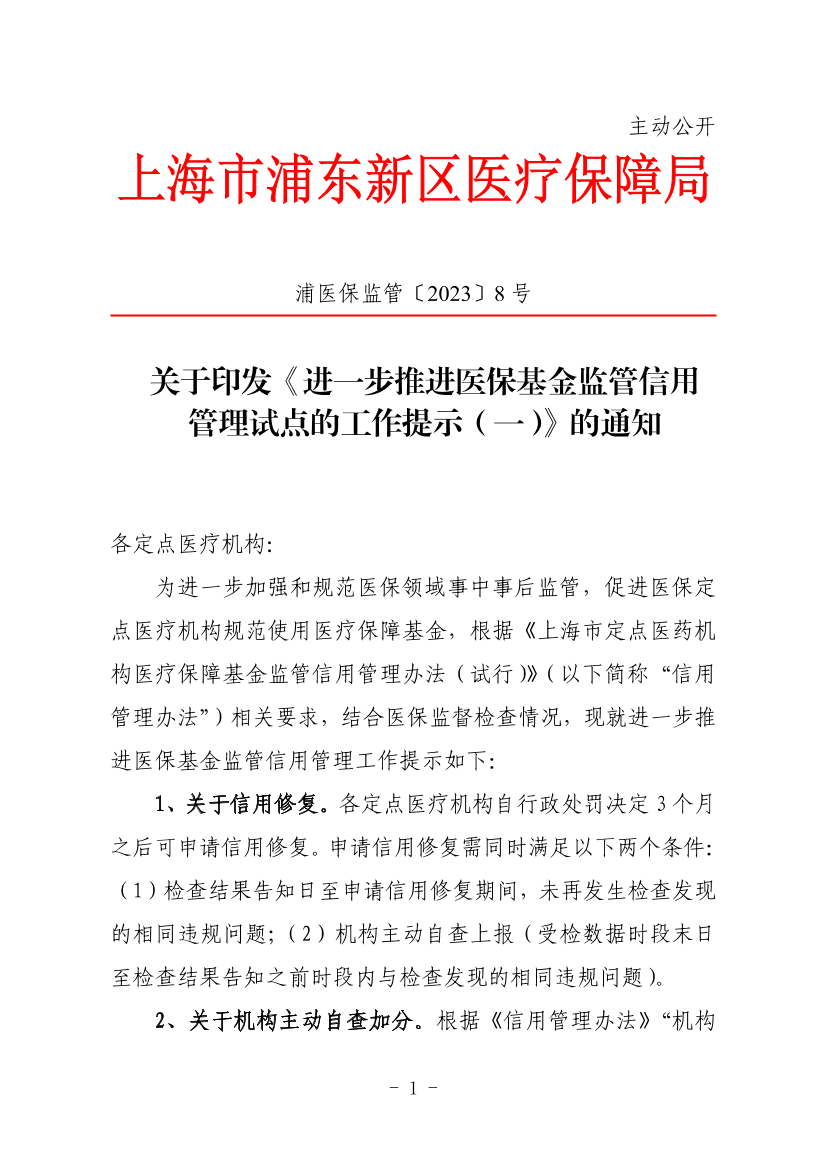 ??為進(jìn)一步加強(qiáng)和規(guī)范醫(yī)保領(lǐng)域事中事后監(jiān)管,促進(jìn)醫(yī)保定點(diǎn)醫(yī)療機(jī)構(gòu)規(guī)范使用醫(yī)療保障基金,根據(jù)《上海市定點(diǎn)醫(yī)藥機(jī)構(gòu)醫(yī)療保障基金監(jiān)管信用管理辦法(試行)》(以下簡(jiǎn)稱(chēng)“信用管理辦法”)相關(guān)要求,結(jié)合醫(yī)保監(jiān)督檢查情況,現(xiàn)就進(jìn)一步推進(jìn)醫(yī)保基金監(jiān)管信用管理工作提示如下: