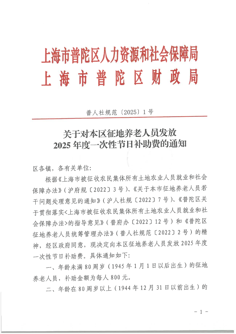 ??根據(jù)《上海市被征收農(nóng)民集體所有土地農(nóng)業(yè)人員就業(yè)和社會保障辦法》(滬府規(guī)〔2022〕3號)、《關(guān)于本市征地養(yǎng)老人員若干問題處理意見的通知》(滬人社規(guī)〔2022〕7號)、《普陀區(qū)關(guān)于貫徹落實<上海市被征收農(nóng)民集體所有土地農(nóng)業(yè)人員就業(yè)和社會保障辦法>的指導(dǎo)意見》(普府辦〔2022〕12號)和《普陀區(qū)征地養(yǎng)老人員統(tǒng)籌管理辦法》(普人社規(guī)范〔2022〕2號)的精神,經(jīng)區(qū)政府同意,現(xiàn)決定向本區(qū)征地養(yǎng)老人員發(fā)放2025年度一次性節(jié)日補助費。具體通知如下: