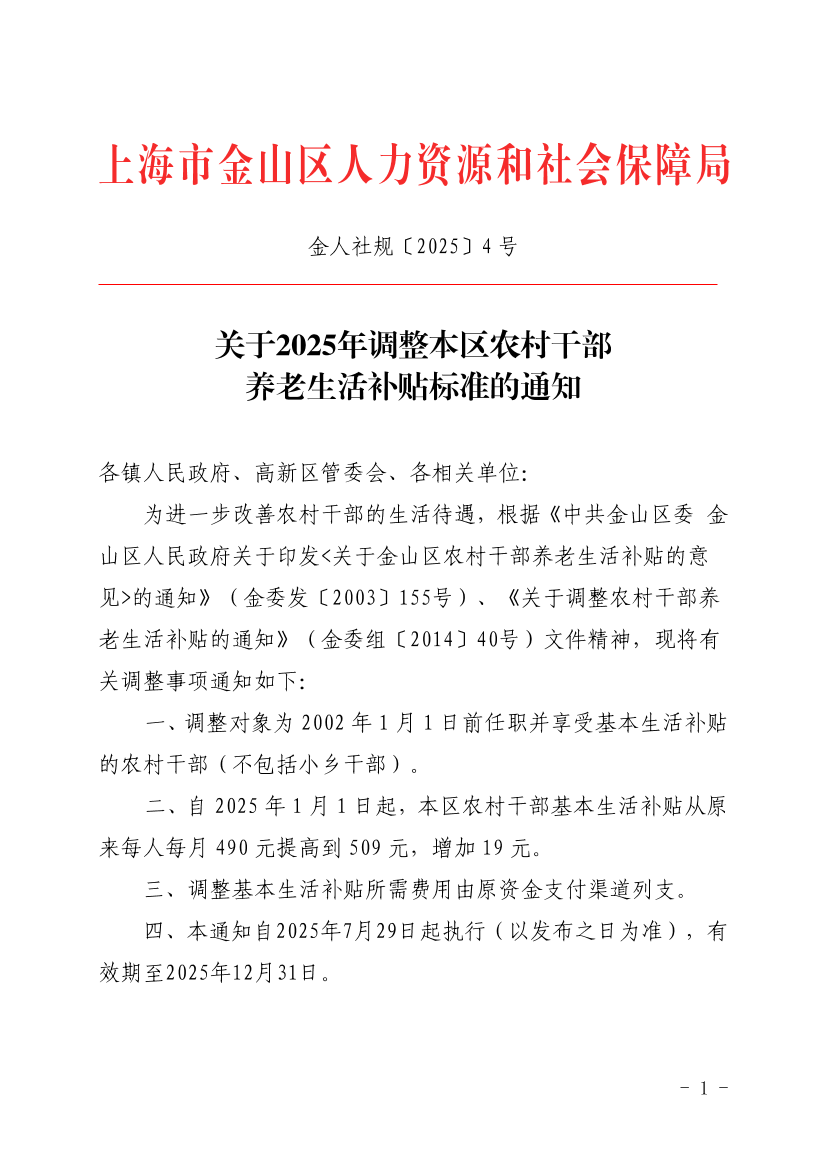 ??二、自2025年1月1日起,本區(qū)農(nóng)村干部基本生活補(bǔ)貼從原來每人每月490元提高到509元,增加19元。