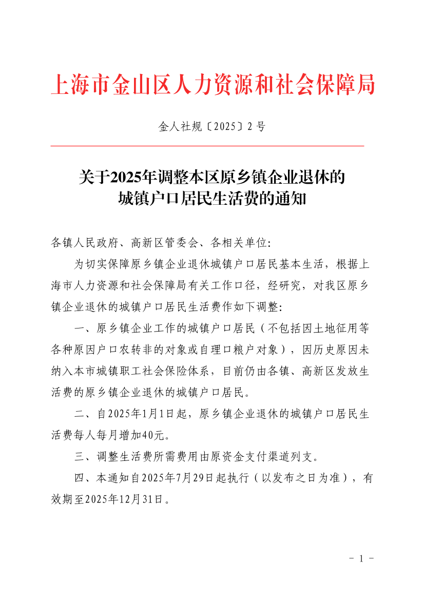 ??二、自2025年1月1日起,原鄉(xiāng)鎮(zhèn)企業(yè)退休的城鎮(zhèn)戶口居民生活費(fèi)每人每月增加40元。