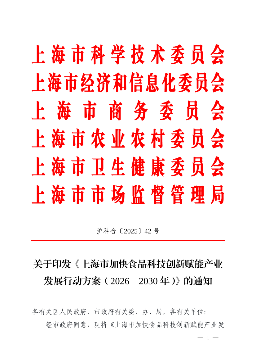 ??經(jīng)市政府同意,現(xiàn)將《上海市加快食品科技創(chuàng)新賦能產(chǎn)業(yè)發(fā)展行動(dòng)方案(2026—2030年)》印發(fā)給你們,請(qǐng)認(rèn)真推進(jìn)落實(shí)。