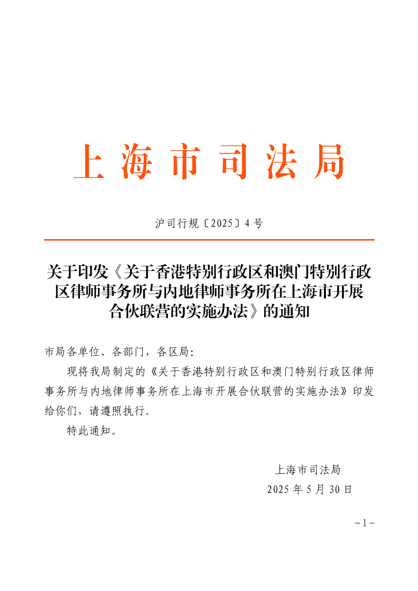 關(guān)于印發(fā)《關(guān)于香港特別行政區(qū)和澳門特別行政區(qū)律師事務(wù)所與內(nèi)地律師事務(wù)所在上海市開展合伙聯(lián)營的實(shí)施辦法》的通知