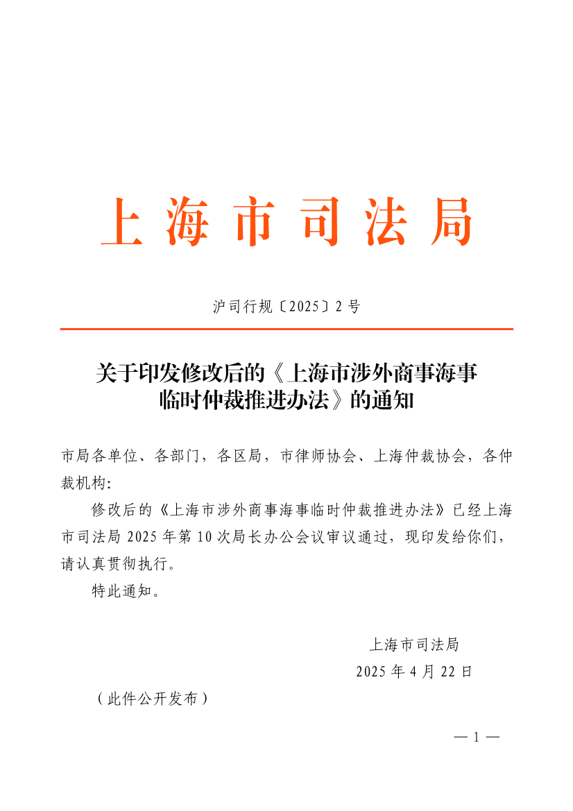 關(guān)于印發(fā)修改后的《上海市涉外商事海事臨時仲裁推進辦法》的通知