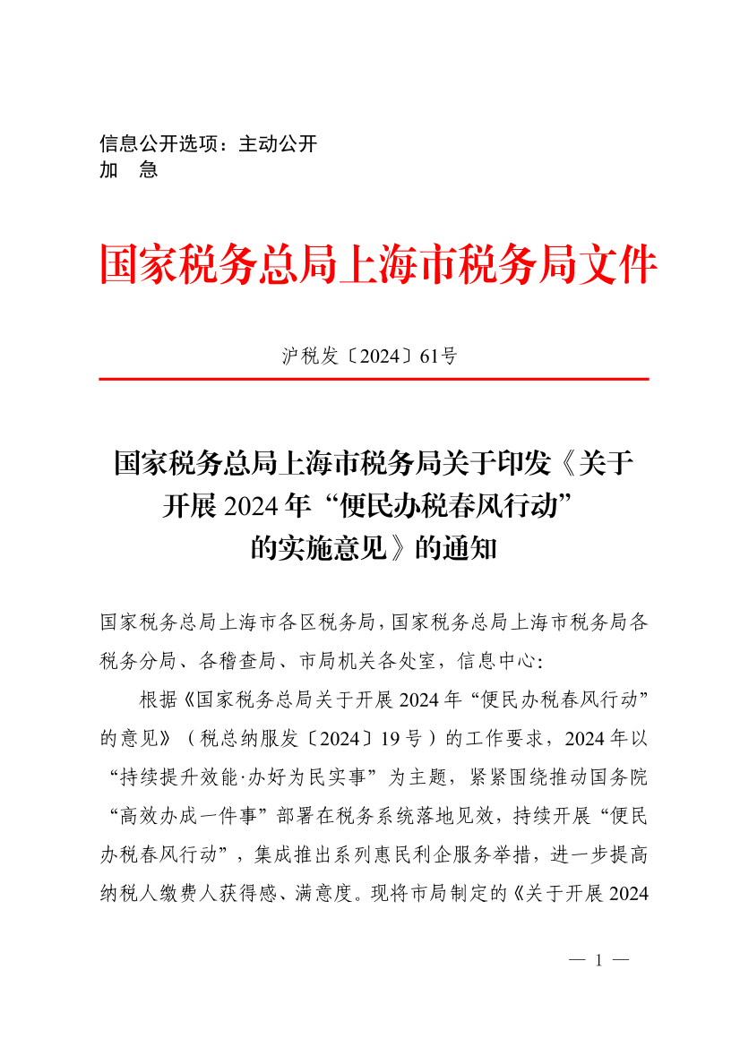 ??根據(jù)《國家稅務總局關于開展2024年“便民辦稅春風行動”的意見》(稅總納服發(fā)〔2024〕19號)的工作要求,2024年以“持續(xù)提升效能·辦好為民實事”為主題,緊緊圍繞推動國務院“高效辦成一件事”部署在稅務系統(tǒng)落地見效,持續(xù)開展“便民辦稅春風行動”,集成推出系列惠民利企服務舉措,進一步提高納稅人繳費人獲得感、滿意度?,F(xiàn)將市局制定的《關于開展2024年“便民辦稅春風行動”的實施意見》印發(fā)給你們,請各單位、各部門結合工作實際遵照執(zhí)行。