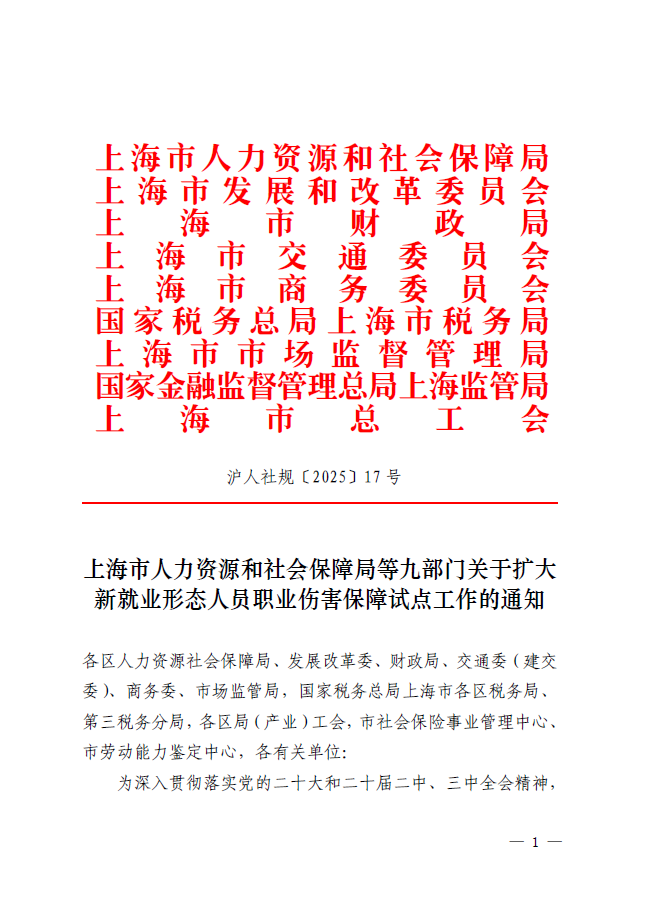 ??為深入貫徹落實(shí)黨的二十大和二十屆二中、三中全會(huì)精神,進(jìn)一步保障新就業(yè)形態(tài)人員合法權(quán)益,根據(jù)《人力資源社會(huì)保障部等九部門關(guān)于擴(kuò)大新就業(yè)形態(tài)人員職業(yè)傷害保障試點(diǎn)的通知》(人社部發(fā)〔2025〕24號(hào))要求,在鞏固深化本市前期新就業(yè)形態(tài)人員職業(yè)傷害保障試點(diǎn)(以下簡(jiǎn)稱職業(yè)傷害保障試點(diǎn))成果的基礎(chǔ)上,結(jié)合工作實(shí)際,我們制定了《上海市新就業(yè)形態(tài)人員職業(yè)傷害保障實(shí)施辦法》,現(xiàn)就擴(kuò)大職業(yè)傷害保障試點(diǎn)有關(guān)事項(xiàng)通知如下: