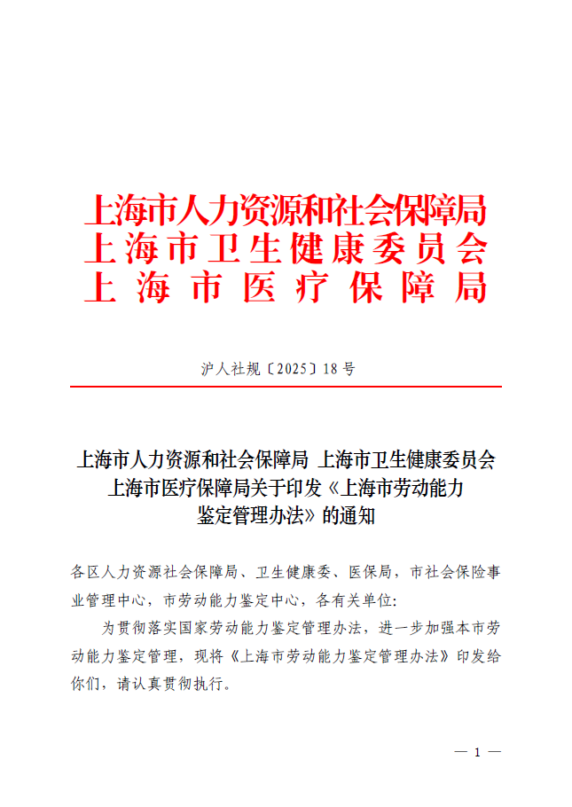 ??第三十九條 本辦法自2025年9月1日起施行,有效期至2030年8月31日。本辦法實(shí)施后,《上海市人力資源和社會(huì)保障局 上海市衛(wèi)生健康委員會(huì) 上海市醫(yī)療保障局關(guān)于印發(fā)〈上海市勞動(dòng)能力鑒定管理辦法〉的通知》(滬人社規(guī)〔2022〕31號(hào))同時(shí)廢止。