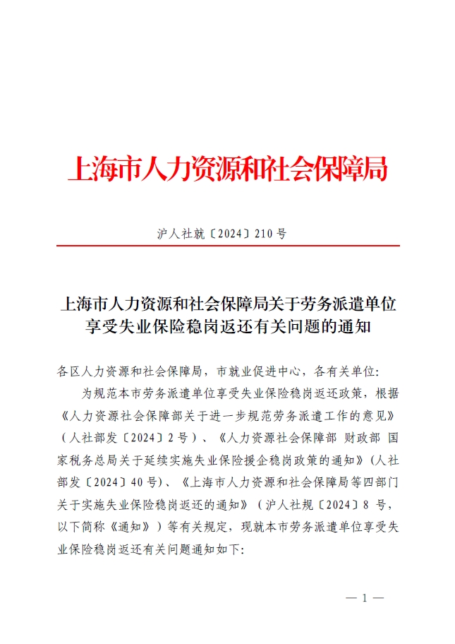 ??為規(guī)范本市勞務派遣單位享受失業(yè)保險穩(wěn)崗返還政策,根據(jù)《人力資源社會保障部關(guān)于進一步規(guī)范勞務派遣工作的意見》(人社部發(fā)〔2024〕2號)、《人力資源社會保障部 財政部 國家稅務總局關(guān)于延續(xù)實施失業(yè)保險援企穩(wěn)崗政策的通知》(人社部發(fā)〔2024〕40號)、《上海市人力資源和社會保障局等四部門關(guān)于實施失業(yè)保險穩(wěn)崗返還的通知》(滬人社規(guī)〔2024〕8 號,以下簡稱《通知》)等有關(guān)規(guī)定,現(xiàn)就本市勞務派遣單位享受失業(yè)保險穩(wěn)崗返還有關(guān)問題通知如下:
