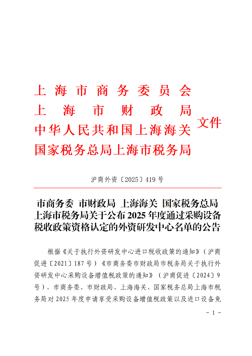 ??根據(jù)《關(guān)于執(zhí)行外資研發(fā)中心進口稅收政策的通知》(滬商促進〔2021〕187號)《市商務(wù)委市財政局市稅務(wù)局關(guān)于執(zhí)行外資研發(fā)中心采購設(shè)備增值稅政策的通知》(滬商促進〔2024〕9號),市商務(wù)委、市財政局、上海海關(guān)、國家稅務(wù)總局上海市稅務(wù)局對2025年度申請享受采購設(shè)備增值稅政策以及進口設(shè)備免稅政策的外資研發(fā)中心進行了資格認(rèn)定,共有2家外資研發(fā)中心通過了采購設(shè)備增值稅政策資格認(rèn)定,1家外資研發(fā)中心通過了進口設(shè)備免稅政策資格認(rèn)定?,F(xiàn)將名單公告如下: