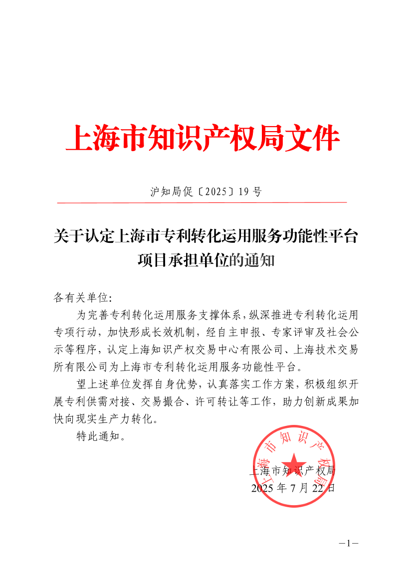 ??為完善專利轉(zhuǎn)化運(yùn)用服務(wù)支撐體系,縱深推進(jìn)專利轉(zhuǎn)化運(yùn)用專項(xiàng)行動(dòng),加快形成長效機(jī)制,經(jīng)自主申報(bào)、專家評審及社會(huì)公示等程序,認(rèn)定上海知識(shí)產(chǎn)權(quán)交易中心有限公司、上海技術(shù)交易所有限公司為上海市專利轉(zhuǎn)化運(yùn)用服務(wù)功能性平臺(tái)。
