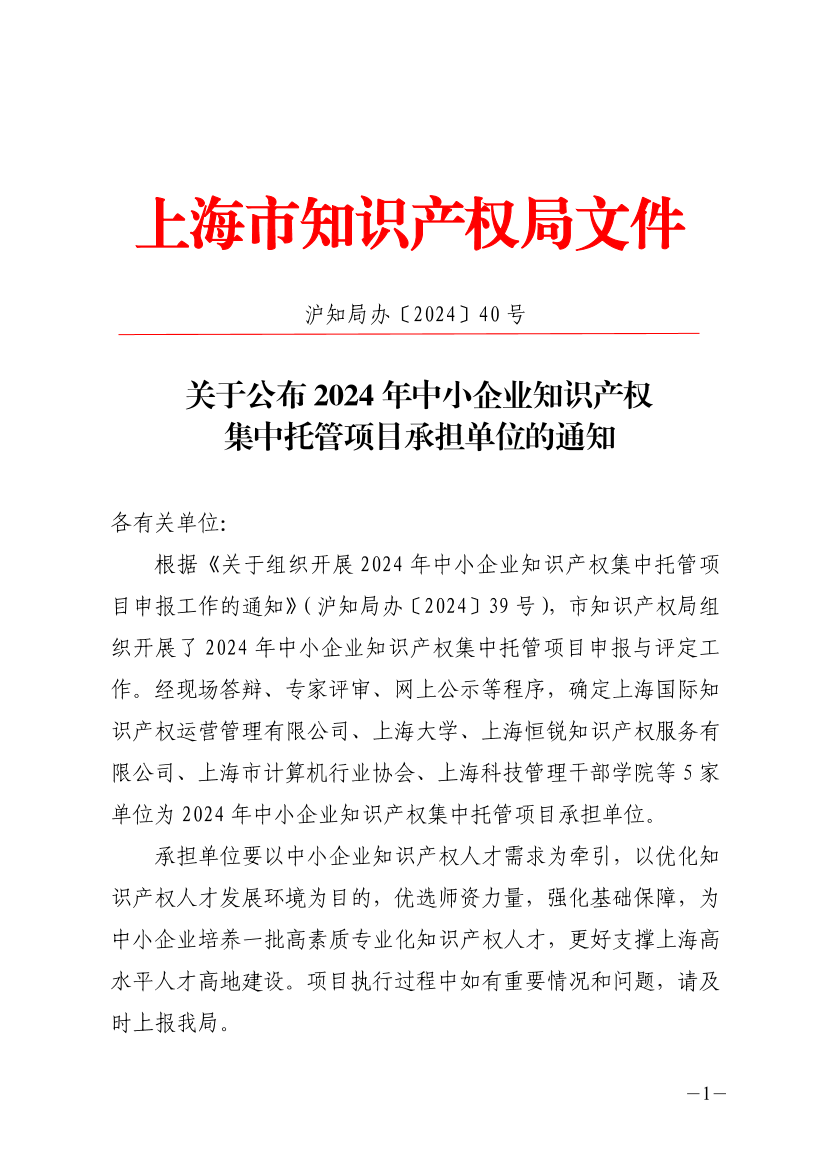 ??根據(jù)《關(guān)于組織開(kāi)展2024年中小企業(yè)知識(shí)產(chǎn)權(quán)集中托管項(xiàng)目申報(bào)工作的通知》(滬知局辦〔2024〕39號(hào)),市知識(shí)產(chǎn)權(quán)局組織開(kāi)展了2024年中小企業(yè)知識(shí)產(chǎn)權(quán)集中托管項(xiàng)目申報(bào)與評(píng)定工作。經(jīng)現(xiàn)場(chǎng)答辯、專(zhuān)家評(píng)審、網(wǎng)上公示等程序,確定上海國(guó)際知識(shí)產(chǎn)權(quán)運(yùn)營(yíng)管理有限公司、上海大學(xué)、上海恒銳知識(shí)產(chǎn)權(quán)服務(wù)有限公司、上海市計(jì)算機(jī)行業(yè)協(xié)會(huì)、上海科技管理干部學(xué)院等5家單位為2024年中小企業(yè)知識(shí)產(chǎn)權(quán)集中托管項(xiàng)目承擔(dān)單位。