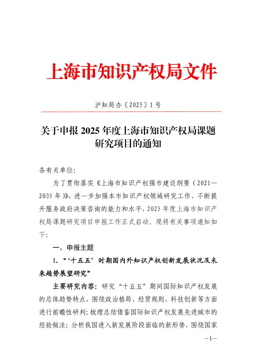 ??為了貫徹落實(shí)《上海市知識(shí)產(chǎn)權(quán)強(qiáng)市建設(shè)綱要(2021—2035年)》,進(jìn)一步加強(qiáng)本市知識(shí)產(chǎn)權(quán)領(lǐng)域研究工作,不斷提升服務(wù)政府決策咨詢的能力和水平,2025年度上海市知識(shí)產(chǎn)權(quán)局課題研究項(xiàng)目申報(bào)工作正式啟動(dòng)。現(xiàn)將有關(guān)事項(xiàng)通知如下: