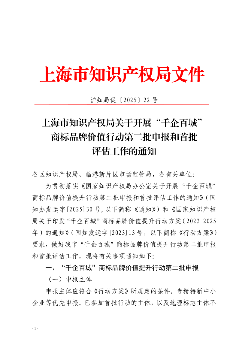 ??為貫徹落實《國家知識產(chǎn)權(quán)局辦公室關(guān)于開展“千企百城”商標品牌價值提升行動第二批申報和首批評估工作的通知》(國知辦發(fā)運字[2025]30號,以下簡稱《通知》)和《國家知識產(chǎn)權(quán)局關(guān)于印發(fā)“千企百城”商標品牌價值提升行動方案(2023-2025年)的通知》(國知發(fā)運字[2023]13號,以下簡稱《行動方案》)要求,做好我市“千企百城”商標品牌價值提升行動第二批申報和首批評估工作,現(xiàn)將有關(guān)事項通知如下: