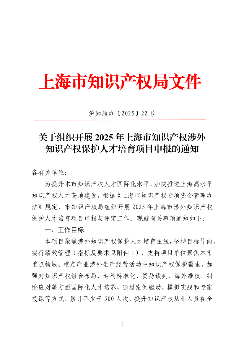 ??為提升本市知識(shí)產(chǎn)權(quán)人才國(guó)際化水平,加快推進(jìn)上海高水平知識(shí)產(chǎn)權(quán)人才高地建設(shè),根據(jù)《上海市知識(shí)產(chǎn)權(quán)專項(xiàng)資金管理辦法》規(guī)定,市知識(shí)產(chǎn)權(quán)局組織開(kāi)展2025年上海市涉外知識(shí)產(chǎn)權(quán)保護(hù)人才培育項(xiàng)目申報(bào)與評(píng)定工作?,F(xiàn)就有關(guān)事項(xiàng)通知如下: