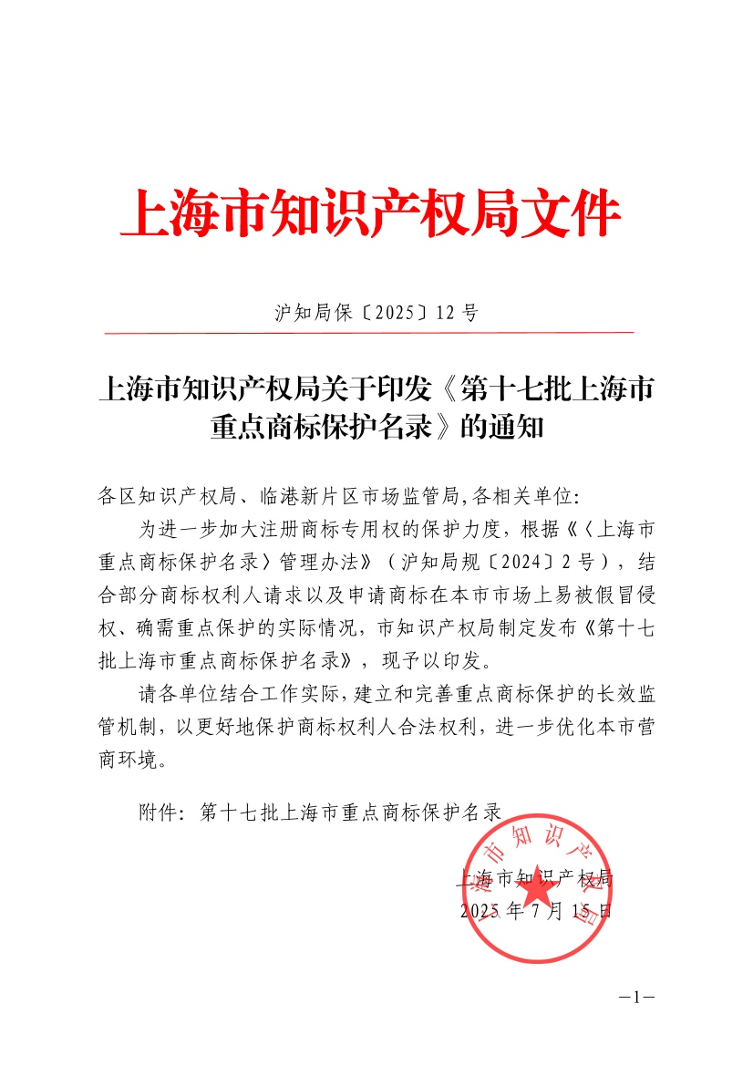 ??為進(jìn)一步加大注冊(cè)商標(biāo)專用權(quán)的保護(hù)力度,根據(jù)《〈上海市重點(diǎn)商標(biāo)保護(hù)名錄〉管理辦法》(滬知局規(guī)〔2024〕2號(hào)),結(jié)合部分商標(biāo)權(quán)利人請(qǐng)求以及申請(qǐng)商標(biāo)在本市市場(chǎng)上易被假冒侵權(quán)、確需重點(diǎn)保護(hù)的實(shí)際情況,市知識(shí)產(chǎn)權(quán)局制定發(fā)布《第十七批上海市重點(diǎn)商標(biāo)保護(hù)名錄》,現(xiàn)予以印發(fā)。