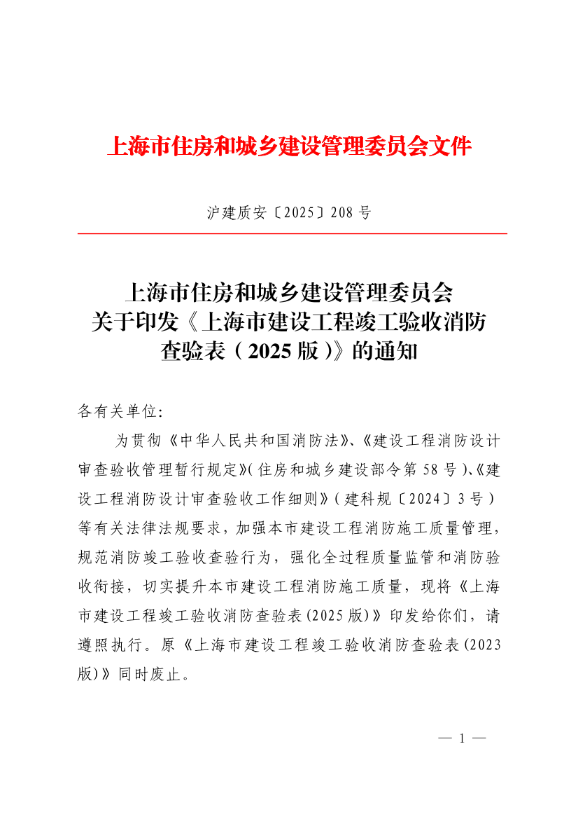??為貫徹《中華人民共和國消防法》、《建設(shè)工程消防設(shè)計審查驗(yàn)收管理暫行規(guī)定》(住房和城鄉(xiāng)建設(shè)部令第58號)、《建設(shè)工程消防設(shè)計審查驗(yàn)收工作細(xì)則》(建科規(guī)〔2024〕3號)等有關(guān)法律法規(guī)要求,加強(qiáng)本市建設(shè)工程消防施工質(zhì)量管理,規(guī)范消防竣工驗(yàn)收查驗(yàn)行為,強(qiáng)化全過程質(zhì)量監(jiān)管和消防驗(yàn)收銜接,切實(shí)提升本市建設(shè)工程消防施工質(zhì)量,現(xiàn)將《上海市建設(shè)工程竣工驗(yàn)收消防查驗(yàn)表(2025版)》印發(fā)給你們,請遵照執(zhí)行。原《上海市建設(shè)工程竣工驗(yàn)收消防查驗(yàn)表(2023版)》同時廢止。